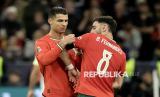 Pemain Portugal Cristiano Ronaldo menyerahkan ban kapten kepada Bruno Fernandez pada pertandingan final kejuaraan UEFA Nations League melawan Spanyol di Allianz Arena, Munich, Jerman, Senin (9/6/2025) dini hari WIB. Portugal meraih gelar kedua di UEFA Nations League dengan mengalahkan juara bertahan Spanyol. Selecao das Quinas menang 5-3 melalui adu penalti. Pada pertandingan itu Ronaldo mencetak satu gol di menit ke-61. (FOTO : EPA-EFE/RONALD WITTEK)