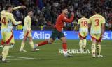 Pemain Portugal Cristiano Ronaldo mencetak gol ke gawang Spanyol pada pertandingan final kejuaraan UEFA Nations League di Allianz Arena, Munich, Jerman, Senin (9/6/2025) dini hari WIB. Portugal meraih gelar kedua di UEFA Nations League dengan mengalahkan juara bertahan Spanyol. Selecao das Quinas menang 5-3 melalui adu penalti. Pada pertandingan itu Ronaldo mencetak satu gol di menit ke-61. (FOTO : AP Photo/Martin Meissner)