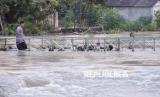 Warga bermain di jembatan yang terendam banjir di Jalan Raya Nyayat, Kecamatan Benjeng, Gresik, Jawa Timur, Selasa (10/6/2025). Banjir setinggi 50-100 cm akibat luapan Kali Lamong tersebut mengakibatkan 10 desa di Kecamatan Benjeng terendam banjir. (FOTO : ANTARA FOTO/Rizal Hanafi)