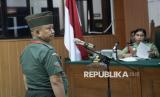 Terdakwa penembakan tiga polisi di Way Kanan, Lampung Kopda Basarsyah (kiri) menjalani persidangan perdana di Pengadilan Militer I-04 Palembang, Sumatera Selatan, Rabu (11/6/2025). Sidang tersebut beragendakan pembacaan dakwaan terhadap tersangka Kopda Basarsyah anggota Subramil Negara Bantin terkait kasus penembakan tiga orang anggota Polres Way Kanan di lokasi penggerebekan judi sabung ayam. (FOTO : ANTARA FOTO/Nova Wahyudi)
