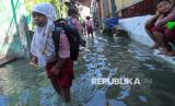 REPUBLIKA.CO.ID, SURABAYA -- Pelajar melintasi banjir rob yang menggenangi kampung Kalianak Timur, Surabaya, Jawa Timur, Rabu (11/6/2025).