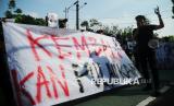 Sejumlah orang dari Persatuan Mahasiswa Aceh Jakarta Raya melakukan aksi di depan Gedung Kementerian Dalam Negeri, Jakarta, Jumat (13/6/2025). Dalam aksinya mereka menuntut pembatalan SK Kemendagri yang menetapkan empat pulau yang tadinya milik Provinsi Aceh menjadi milik Provinsi Sumatera Utara. Keempat pulau itu yakni Pulau Lipan, Pulau Panjang, Pulau Mangkir Ketek, dan Pulau Mangkir Gadang. (FOTO : Republika/Prayogi)