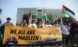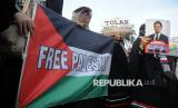 Sejumlah umat Muslim menggelar unjuk rasa solidaritas untuk Gaza di depan Kedutaan Besar Amerika Serikat, Jakarta, Jumat (13/6/2025). Dalam aksinya, mereka mengecam keras pencegatan kapal kemanusiaan Madleen oleh Israel. Kapal yang membawa para aktivis pro-Palestina dari berbagai negara itu dicegat sekitar 185 kilometer dari pantai Gaza pada Senin dini hari (9/6/2025). Madleen bertolak dari Pelabuhan Catania, Pulau Sisilia, Italia, pada 1 Juni 2025, membawa bantuan kemanusiaan berupa makanan, obat-obatan, dan peralatan medis untuk warga Gaza, dalam upaya menembus blokade Israel. (FOTO : Republika/Prayogi)