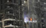 Api dan asap terlihat dari sebuah gedung yang terkena serangan rudal Iran di Tel Aviv, Israel, Sabtu (14/6/2025) dinihari. Iran membalas serangan Israel dengan meluncurkan rudal-rudal balistik ke Tel Aviv. Militer Israel (IDF) lewat unggahan di media sosial mengatakan semua wilayah Israel sedang diserang. (FOTO : AP Photo/Tomer Appelbaum)