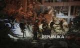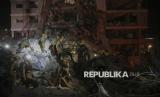 Pasukan keamanan Israel memeriksa kondisi bangunan yang hancur setelah terkena serangan rudal Iran di Tel Aviv, Israel, Ahad (15/6/2025). Channel 13 Israel melaporkan, serangan Iran menyebabkan kehancuran yang belum pernah terjadi sebelumnya di wilayah Tel Aviv, dengan puluhan bangunan rusak akibat rudal Iran atau pecahan peluru kendali. (FOTO : AP Photo/Ohad Zwigenberg)
