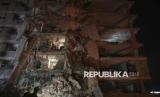Penampakan kondisi bangunan yang hancur setelah terkena serangan rudal Iran di Tel Aviv, Israel, Ahad (15/6/2025). Channel 13 Israel melaporkan, serangan Iran menyebabkan kehancuran yang belum pernah terjadi sebelumnya di wilayah Tel Aviv, dengan puluhan bangunan rusak akibat rudal Iran atau pecahan peluru kendali. (FOTO : AP Photo/Ohad Zwigenberg)