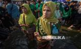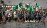 Sejumlah warga Nahdliyin berjalan menerobos genangan banjir rob menuju acara Istighatsah Kemanusiaan yang diselenggarakan Nahdlatul Ulama (NU) dari berbagai tingkatan organisasi di Jalur Pantura, Kecamatan Sayung, Kabupaten Demak, Jawa Tengah, Ahad (15/6/2025). Acara doa bersama yang dihadiri ribuan warga NU dan masyarakat pesisir Demak itu merupakan aksi keprihatinan dalam menyikapi keadaan lingkungan di pesisir utara Demak yang semakin parah terdampak bencana banjir rob di jalur pantura Demak dan di permukiman warga sejak sekitar tahun 2000-an. (FOTO : ANTARA FOTO/Aji Styawan)