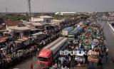 Foto udara warga memadati jalan saat menggelar Istighatsah Kemanusiaan yang diselenggarakan Nahdlatul Ulama (NU) dari berbagai tingkatan organisasi di Jalur Pantura, Kecamatan Sayung, Kabupaten Demak, Jawa Tengah, Ahad (15/6/2025). Acara doa bersama yang dihadiri ribuan warga NU dan masyarakat pesisir Demak itu merupakan aksi keprihatinan dalam menyikapi keadaan lingkungan di pesisir utara Demak yang semakin parah terdampak bencana banjir rob di jalur pantura Demak dan di permukiman warga sejak sekitar tahun 2000-an. (FOTO : ANTARA FOTO/Aji Styawan)