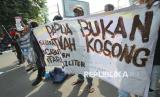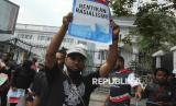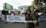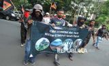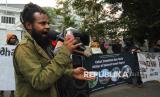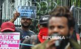 REPUBLIKA.CO.ID, BANDUNG -- Sejumlah massa dari Papua yang tergabung dalam Front Rakyat Anti Investasi dan Militerisme menggelar aksi di depan DPRD Jawa Barat, Jalan Diponegoro, Kota Bandung, Senin (16/6/2025).