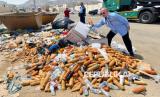 Air zamzam berbagai kemasan yang dibuang karena tak lolos pemeriksaan di gudang Air Gate Kargo, Makkah, Arab Saudi, Senin (16/6/2025). Air zamzam dalam berbagai kemasan dilarang untuk dibawa oleh pihak maskapai di koper bagasi. Jamaah haji Indonesia banyak coba mengakali dengan melakban dan memasukkan air zamzam ke dalam koper besar, tapi tetap terdeteksi di X Ray. (FOTO : Teguh Firmansyah/Republika)