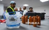 Petugas menunjukkan air zamzam berbagai kemasan yang dibuang karena tak lolos pemeriksaan di gudang Air Gate Kargo, Makkah, Arab Saudi, Senin (16/6/2025). Air zamzam dalam berbagai kemasan dilarang untuk dibawa oleh pihak maskapai di koper bagasi. Jamaah haji Indonesia banyak coba mengakali dengan melakban dan memasukkan air zamzam ke dalam koper besar, tapi tetap terdeteksi di X Ray. (FOTO : Teguh Firmansyah/Republika)