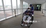 Jamaah haji berjalan menggunakan kursi roda menuju pesawat Saudi Airlines di Bandara Internasional Kualanamu, Kabupeten Deli Serdang, Sumatera Utara, Rabu (18/6/2025). Sebanyak 442 jamaah haji yang menumpangi pesawat Saudi Airlines dengan nomor penerbangan SV 5276 dipulangkan ke Jakarta setelah sempat mendarat darurat di Bandara Internasional Kualanamu karena adanya dugaan teror bom terhadap penerbangan pesawat tersebut. (FOTO : ANTARA FOTO/Yudi Manar)