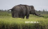 Seekor gajah sumatra (Elephas maximus sumatranus) mencari makan di areal Suaka Margasatwa Padang Sugihan, Ogan Komering Ilir (OKI), Sumatera Selatan, Rabu (18/6/2025). Suaka Margasatwa Padang Sugihan yang memiliki luas sekitar 600 ribu hektare dengan lanskap yang meliputi hutan tanaman industri, hutan rawa gambut, perkebunan sawit, dan pertanian masyarakat tersebut menjadi rumah bagi 127 ekor Gajah Sumatra. (FOTO : ANTARA FOTO/Nova Wahyudi)