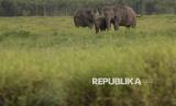 REPUBLIKA.CO.ID, OKI -- Tiga ekor gajah sumatra (Elephas maximus sumatranus) mencari makan di areal Suaka Margasatwa Padang Sugihan, Ogan Komering Ilir (OKI), Sumatera Selatan, Rabu (18/6/2025).