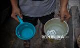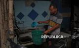 Rifai (54) menuangkan air di tempat penampungan air bersih di rumahnya di kawasan Gang Masjid RT19/RW17, Muara Baru, Jakarta Utara, Kamis (19/6/2025). Rifai menuturkan, kebutuhan air bersih mengalami kendala sejak 2004 akibat tidak berfungsinya jalur pipa air bersih yang tersendat dan rusak. Untuk memenuhi kebutuhan masak, mandi dan cuci, Rifai membeli air bersih dari warga dengan harga iuran Rp50 hingga Rp65 ribu per bulan. Saat kondisi air terbatas, Ia menggunakan air sumur untuk kebutuhannya, meski kondisi airnya tidak layak pakai. Rifai berharap, pemerintah provinsi DKI Jakarta segera memperbaiki aliran pipa air untuk warga di kawasan tersebut, sehingga kebutuhan air bersih dapat mengalir ke setiap pintu rumah di kawasan tersebut tanpa khawatir kekurangan. (FOTO : Republika/Thoudy Badai)