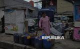 Juhari (45) mengisi air dari sumur bersama di pemukiman kawasan Gang Masjid RT19/RW17, Muara Baru, Jakarta Utara, Kamis (19/6/2025). Warga Muara Baru dihadapkan pada persoalan ketersediaan air bersih. Jalur pipa air bersih di wilayah itu tidak berfungsi sejak 2004. Untuk memenuhi kebutuhan masak, mandi dan cuci, warga membeli air bersih dengan sistem iuran sebesar Rp50 hingga Rp65 ribu per bulan. Warga berharap, pemerintah provinsi DKI Jakarta segera memperbaiki aliran pipa air untuk warga di kawasan tersebut, sehingga kebutuhan air bersih dapat mengalir ke setiap pintu rumah. (FOTO : Republika/Thoudy Badai)