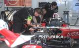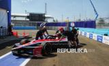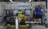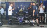 Para kru tim balap Formula E tengah mempersiapkan mobil di paddock menjelang balap mobil listrik Formula E World Championship musim ke-11 di Jakarta International E-Prix Circuit (JIEC), Jakarta, Jumat (20/6/2025). Tim dan kru pembalap sudah mulai melakukan berbagai persiapan untuk menghadapi balapan yang dijadwalkan berlangsung pada besok, Sabtu (22/6/2025). Sebanyak 22 pebalap dan 11 tim dari sejumlah negara akan berkompetisi dalam ajang balap mobil listrik Jakarta E-Prix 2025. Tahun ini merupakan tahun ketiga penyelenggaraan Jakarta E-Prix. (FOTO : Republika/Prayogi)