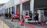 Suasana persiapan di Paddock menjelang menjelang balap mobil listrik Formula E World Championship musim ke-11 di Jakarta International E-Prix Circuit (JIEC), Jakarta, Jumat (20/6/2025). Tim dan kru pembalap sudah mulai melakukan berbagai persiapan untuk menghadapi balapan yang dijadwalkan berlangsung pada besok, Sabtu (22/6/2025). Sebanyak 22 pebalap dan 11 tim dari sejumlah negara akan berkompetisi dalam ajang balap mobil listrik Jakarta E-Prix 2025. Tahun ini merupakan tahun ketiga penyelenggaraan Jakarta E-Prix. (FOTO : Republika/Prayogi)