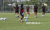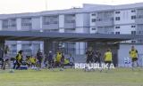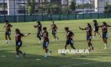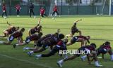 REPUBLIKA.CO.ID, JAKARTA -- Pesepak bola Timnas Putri Indonesia melakukan pemanasan saat berlatih di Lapangan Latihan Jakarta Internasional Stadium (JIS), Jakarta, Jumat (20/6/2025).