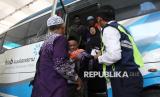 Jamaah haji penumpang pesawat Saudia Airlines SV-5688 turun dari bus untuk dipindahkan ke hotel di Bandara Internasional Kualanamu, Kabupeten Deli Serdang, Sumatera Utara, Sabtu (21/6/2025). Sebanyak 376 jamaah haji yang menumpangi pesawat Saudi Airlines SV-5688 dengan rute Jeddah Arab Saudi-Surabaya dipindahkan ke hotel usai mendarat darurat di Bandara Internasional Kualanamu setelah dugaan menerima ancaman bom di dalam pesawat yang dikirim melalui pesan email. (FOTO : ANTARA FOTO/Yudi Manar)