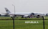 Petugas melakukan pemeriksaan pesawat Saudia Airlines nomor penerbangan SV-5688 di landasan usai mendarat darurat di Bandara Internasional Kualanamu, Kabupaten Deli Serdang, Sumatera Utara, Sabtu (21/6/2025). Pesawat Saudia yang berangkat dari Jeddah tujuan Surabaya dengan membawa sebanyak 376 jamaah haji mendarat darurat di Bandara Internasional Kualanmu akibat adanya dugaan teror bom. (FOTO : ANTARA FOTO/Yudi Manar)