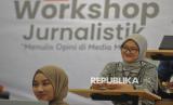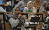 Peserta mengajukan pertanyaan saat sesi materi dari Redaktur Pelaksana Republika Subroto Kardjo dalam kegiatan Workshop Jurnalistik di Jakarta, Sabtu (21/6/2025). Kegiatan tersebut diikuti oleh puluhan peserta dari berbagai kalangan mulai dari pelajar, mahasiswa, pekerja hingga pengajar. Workshop Jurnalistik tersebut membahas tentang cara menulis opini di media massa, kerja-kerja jurnalistik dan kondisi dapur redaksi Republika. Kegiatan tersebut diharapkan mampu mengedukasi dan memudahkan para peserta dalam proses pembuatan berita dan opini. (FOTO : Republika/Thoudy Badai)