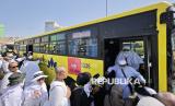 REPUBLIKA.CO.ID, MAKKAH -- Jamaah haji Indonesia antre memasuki bus Shalawat seusai beribadah di Masjidil Haram di terminal Shib Amir, Makkah, Arab Saudi, Sabtu (21/6/2025).