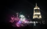 Atraksi kembang api pada malam puncak HUT ke-498 Jakarta di Lapangan Banteng, Jakarta, Ahad (22/6/2025). Perayaan HUT ke-498 Jakarta yang mengusung tema Jakarta Kota Global dan Berbudaya tersebut selain menampilkan atraksi kembang api juga menghadirkan berbagai hiburan diantaranya band Wali, JKT48 dan Juicy Luicy. (FOTO : ANTARA FOTO/Muhammad Adimaja)