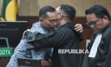 Terdakwa kasus dugaan korupsi pengadaan lahan tanah di daerah Rorotan Indra Sukmono Arharrys (kiri) memeluk kuasa hukum usai sidang putusan di Pengadilan Tipikor, Jakarta Pusat, Rabu (25/6/2025). Majelis Hakim menjatuhkan hukuman kepada Indra Sukmono penjara emapt tahun penjara denda Rp 300 juta subsider empat bulan kurungan. (FOTO : ANTARA FOTO/Fakhri Hermansyah)