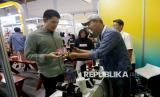 Barista Republikopi Republika Satria K. Yudha (kanan) menjelaskan kopi hasil racikannya kepada publik figur Dimas Seto di booth Mahaka pada ajang BSI International Expo 2025 di Jakarta, Sabtu (28/6/2025). Republika melalui Republikopi turut berpartisipasi di BSI International Expo 2025. Dalam gelaran ini, Republikopi menyajikan kopi-kopi nusantara guna mendukung kesejahteraan petani kopi dan industri kopi Tanah Air. (FOTO : Republika/Edwin Dwi Putranto)