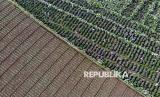 Foto udara sejumlah pengunjung menikmati suasana Ladang Bunga Hortensia (Hydrangea) di Puncak Brakseng, Batu, Jawa Timur, Sabtu (28/6/2025). Akibat menurunnya permintaan bunga dekorasi sejak setahun terakhir, petani setempat mengalihfungsikan lahan pertanian bunga hortensia seluas 7.000 meter persegi miliknya menjadi tempat wisata yang mampu menarik kunjungan wisatawan sekitar 200 hingga 500 orang per hari dengan tiket masuk sebesar Rp10 ribu per orang. (FOTO : ANTARA FOTO/Muhammad Mada)