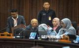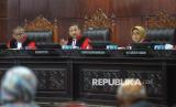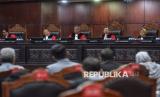 Ketua Mahkamah Konstitusi Suhartoyo bersama Hakim Konstitusi lainnya memimpin jalannya sidang uji materiil UU nomor 28 tahun 2014 tentang Hak Cipta di Mahkamah Konstitusi, Jakarta, Senin (30/6/2025). Sidang tersebut beragendakan mendengarkan keterangan DPR dan Presiden. Sejumlah musisi mengajukan uji materiil terhadap Undang-Undang Nomor 28 Tahun 2014 tentang Hak Cipta ke Mahkamah Konstitusi (MK). Mereka mempermasalahkan beberapa pasal dalam UU tersebut. (FOTO : Republika/Prayogi)