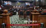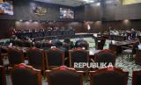 REPUBLIKA.CO.ID, JAKARTA -- Ketua Mahkamah Konstitusi Suhartoyo bersama Hakim Konstitusi lainnya memimpin jalannya sidang uji materiil UU nomor 28 tahun 2014 tentang Hak Cipta di Mahkamah Konstitusi, Jakarta, Senin (30/6/2025).