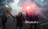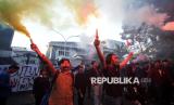 Sambil menyalakan flare, puluhan mahasiswa yang tergabung dalam Badan Eksekutif Mahasiswa Seluruh Indonesia Jawa Barat (Jabar) menggelar aksi unjuk rasa di depan Gedung DPRD Jabar, Jalan Diponegoro, Kota Bandung, Senin (30/6/2025). Aksi tersebut menyikapi pernyataan anggota komisi 1 DPR RI dan Menteri Hukum dan HAM yang menyatakan bahwa masyarakat sipil termasuk mahasiswa tidak memiliki kedudukan dan hak untuk menggugat UU TNI. (FOTO : Edi Yusuf)