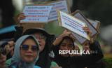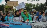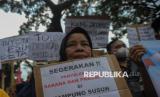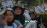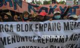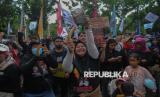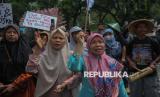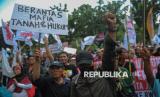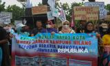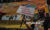Peserta aksi yang tergabung dalam Jaringan Rakyat Miskin Kota (JRMK) menggelar aksi di depan Balai Kota Pemprov DKI Jakarta, Rabu (2/7/2025). Dalam aksinya mereka menuntut Pemprov DKI Jakarta untuk menjamin hak atas ruang hidup warga kampung kota, menjadikan kampung kota sebagai lokasi prioritas pelaksanaan Reforma Agraria Perkotaan, penyelesaian kasus hunian warga di Kampung Bayam, Gang Sumur, Kampung Akuarium dan Muara Angke. (FOTO : Republika/Thoudy Badai)