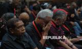 Ketua DPP PDIP Ganjar Pranowo (tengah) bersama tokoh PDIP lainnya Saiful saat menghadiri sidang terdakwa Hasto Kristiyanto di Pengadilan Negeri Tipikor, Jakarta, Kamis (3/7/2025). Sekretaris Jenderal PDI Perjuangan Hasto Kristiyanto dituntut oleh jaksa penuntut umum (JPU) KPK dengan pidana 7 tahun penjara denda Rp600 juta subsidair 6 bulan kurungan penjara. Jaksa penuntut umum (JPU) menilai Hasto telah terbukti melakukan tindak pidana suap dan perintangan penyidikan terhadap perkara Harun Masiku. (FOTO : Republika/Thoudy Badai)
