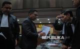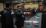 Terdakwa Hasto Kristiyanto berbincang dengan penasihat hukumnya saat akan menjalani sidang pembacaan tuntutan di Pengadilan Negeri Tipikor, Jakarta, Kamis (3/7/2025). Sekretaris Jenderal PDI Perjuangan Hasto Kristiyanto dituntut oleh jaksa penuntut umum (JPU) KPK dengan pidana 7 tahun penjara denda Rp600 juta subsidair 6 bulan kurungan penjara. Jaksa penuntut umum (JPU) menilai Hasto telah terbukti melakukan tindak pidana suap dan perintangan penyidikan terhadap perkara Harun Masiku. (FOTO : Republika/Thoudy Badai)