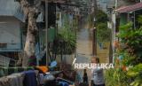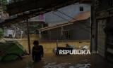 Warga beraktivitas saat banjir merendam permukimannya di kawasan Bidara Cina, Jatinegara, Jakarta, Ahad (6/7/2025). Banjir setinggi sekitar 150 centimeter yang merendam kawasan tersebut diduga akibat air kiriman dari wilayah Bogor yang menyebabkan luapan kali Ciliwung. Menurut warga, luapan kali Ciliwung terjadi pada Ahad (6/7) dini hari pukul 03.00 WIB. Hingga saat ini pukul 12.30 banjir di kawasan Bidara Cina RT10/RW11 mulai berangsur surut dengan ketinggian air bervariasi mulai dari 30-150 centimeter. Meski demikian, warga masih membutuhkan bantuan logistik dan perahu untuk evakuasi warga yang masih terjebak di rumahnya. (FOTO : Republika/Thoudy Badai)