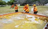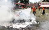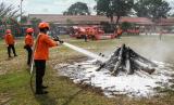 REPUBLIKA.CO.ID, PALANGKA RAYA -- Petugas melakukan simulasi pemadaman kebakaran lahan menggunakan air yang dicampur cairan busa shabondama natural foam di halaman kantor Badan Penanggulangan Bencana Daerah (BPBD) Kota Palangka Raya, Kalimantan Tengah, Jumat (11/7/2025).