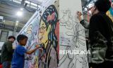 Pengunjung melukis pada papan saat pameran Teras Inspirasi (Terasi) 2025 di Pos Bloc, Jakarta, Sabtu (12/7/2025). Pameran bertajuk 5pecial For You yang menampilkan karya seni ilustrasi melalui instalasi interaktif dan workshop dari 54 ilustrator tersebut bertujuan memperkuat fondasi ekonomi kreatif berbasis ilustrasi berkelanjutan sehingga membuka peluang monetisasi bagi seniman lokal. (FOTO : ANTARA FOTO/Putra M. Akbar)
