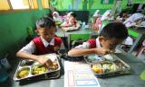 Para siswa menikmati Makan Bergizi Gratis (MBG) Semester 1 Tahun Ajaran 2025/2026 saat Masa Pengenalan Lingkungan Sekolah atau MPLS di SDN 158 Babakan Sari, Kota Bandung, Senin (14/7/2025). Kegiatan tersebut dihadiri oleh Wakil wali Kota Bandung Erwin, dalam sambutannya, Erwin mengatakan program MBG ini adalah wujud nyata kepedulian pemerintah pada masa depan anak-anak. Karena dengan asupan gizi yang baik dan seimbang, anak-anak akan lebih sehat, kuat, dan fokus dalam menyerap ilmu di sekolah. (FOTO : Edi Yusuf)