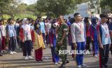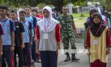 REPUBLIKA.CO.ID, INDRAMAYU -- Anggota Babinsa Koramil 1602 Sindang Indramayu memberikan pelatihan baris-berbaris kepada pelajar pada Masa Pengenalan Lingkungan Sekolah (MPLS) di SMA Negeri 1 Sindang, Indramayu, Jawa Barat, Selasa (15/7/2025).