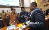 Menteri Sosial Saifullah Yusuf dan Menteri Kesehatan Budi Gunadi Sadikin berbincang dengan anggota DPR sebelum mengikuti rapat kerja dengan Komisi IX DPR di Kompleks Parlemen, Senayan, Jakarta, Selasa (15/7/2025). Rapat tersebut membahas mengenai data Penerima Bantuan Iuran (PBI) Jaminan Kesehatan (JKN) berdasarkan Data Tunggal Sosial Ekonomi Nasional (DTSEN), serta solusi untuk permasalahan data PBI. PBI JKN adalah program bantuan iuran yang dibayarkan pemerintah untuk fakir miskin dan orang tidak mampu, agar mereka terjamin kesehatannya. (FOTO : Republika/Prayogi)