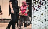 Direktur Sekolah Dasar Direktorat Jenderal Pendidikan Anak Usia Dini, Pendidikan Dasar dan Pendidikan Menengah Kemendikbudristek Tahun 2020–2021 Sri Wahyuningsih (SW) dengan menggunakan rompi tahanan berjalan usai menjalani pemeriksaan kasus dugaan korupsi digitalisasi pendidikan di Kemendikbudristek, di Gedung Kejaksaan Agung, Jakarta, Selasa (15/7/2025). Kejaksaan Agung menetapkan empat tersangka dalam kasus tersebut yaitu Direktur Sekolah Dasar Direktorat Jenderal Pendidikan Anak Usia Dini, Pendidikan Dasar dan Pendidikan Menengah Kemendikbudristek Tahun 2020–2021 Sri Wahyuningsih (SW), Direktur Sekolah Menengah Pertama Direktorat Jenderal Pendidikan Anak Usia Dini, Pendidikan Dasar dan Pendidikan Menengah Kemendikbudristek Tahun 2020–2021 Mulyatsyah (MUL), Staf khusus mantan Mendikbudristek Nadiem Makarim, Jurist Tan (JT/JS) dan Konsultan Teknologi di Kemendikbudristek Ibrahim Arief (IBAM). Dua tersangka, yakni Sri Wahyuningsih dan Mulyatsyah, ditahan di rutan, Sementara Ibrahim menjadi tahanan kota karena memiliki sakit jantung. Sementara, Jurist masih berada di luar negeri. (FOTO : Republika/Prayogi)
