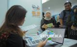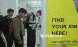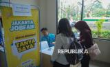Sejumlah pencari kerja mengunjungi salah satu stan perusahaan dalam acara Jakarta Jobfair di GOR Pasar Minggu, Jakarta Selatan, Rabu (16/7/2025). Pemprov DKI Jakarta melalui Dinas Tenaga Kerja dan Transmigrasi menggelar Jakarta Jobfair 2025 di dua titik yakni di GOR Pasar Minggu dan GOR Soemantri yang berlangsung pada 16-17 Juli. Jakarta Jobfair tersebut diikuti oleh sebanyak 40 perusahaan dengan membuka sekitar 2.000 lapangan pekerjaan. (FOTO : Republika/Thoudy Badai)
