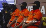 Tiga tersangka kasus penyelundupan Iphone tanpa dokumen resmi dihadirkan saat konferensi pers di Kantor Bea Cukai Batam, Kepulauan Riau, Rabu (16/7/2025). Petugas Bea cukai Bandara Hang Nadim Batam menggagalkan upaya penyelundupan 327 unit Iphone 12 dan 13 tanpa dokumen resmi senilai Rp1,85 miliar dengan mengamankan tiga orang tersangka pelaku penyelundupan pada Sabtu (12/7/2025). (FOTO : ANTARA FOTO/Teguh Prihatna)