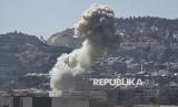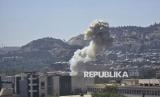 Asap mengepul dari Kompleks Staf Umum Angkatan Darat Suriah setelah serangan udara Israel di pusat kota Damaskus, Suriah, Rabu (16/7/2025). Israel melancarkan serangan udara di Damaskus dengan sasaran gedung Staf Umum, Kementerian Pertahanan, dan sekitar istana kepresidenan. Kantor berita pemerintah Suriah, SANA, mengutip Kementerian Kesehatan mengatakan sedikitnya sembilan orang terluka dalam serangan udara Israel. (FOTO : Esref Musa/Anadolu via Reuters)