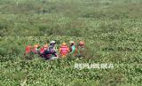 Petugas Desa Tangguh Bencana (Destana) Gunung Putri mendampingi tim Balai Besar Konservasi Sumber Daya Alam (BKSDA) menggunakan perahu karet saat memantau hama tanaman eceng gondok yang memenuhi Situ Gunung Putri, Kabupaten Bogor, Jawa Barat, Jumat (18/7/2025). Eceng gondok yang menutupi permukaan situ menyebabkan pendangkalan dan menjadi salah satu penyebab banjir di kawasan tersebut saat terjadi hujan deras, dan penduduk setempat mengharapkan Pemerintah Provinsi Jawa Barat untuk menangani permasalahan tersebut. (FOTO : ANTARA FOTO/Yulius Satria Wijaya)