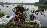 Petugas Desa Tangguh Bencana (Destana) Gunung Putri membersihkan secara swadaya hama tanaman eceng gondok yang memenuhi Situ Gunung Putri, Kabupaten Bogor, Jawa Barat, Jumat (18/7/2025). Eceng gondok yang menutupi permukaan situ menyebabkan pendangkalan dan menjadi salah satu penyebab banjir di kawasan tersebut saat terjadi hujan deras, dan penduduk setempat mengharapkan Pemerintah Provinsi Jawa Barat untuk menangani permasalahan tersebut. (FOTO : ANTARA FOTO/Yulius Satria Wijaya)