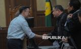 Terdakwa Thomas Trikasih Lembong atau Tom Lembong berbincang dengan penasihat hukumnya saat menjalani sidang pembacaan putusan di Pengadilan Negeri Tipikor, Jakarta, Senin (30/6/2025). Majelis Hakim menjatuhkan hukuman kepada mantan Menteri Perdagangan Tom Lembong dengan pidana 4 tahun dan enam bulan penjara, denda Rp750 juta subsider 6 bulan kurungan dalam kasus dugaan korupsi impor gula. (FOTO : Republika/Thoudy Badai)